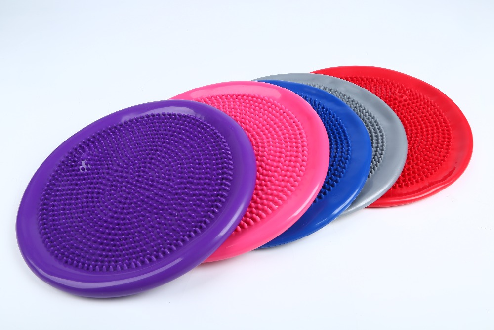 - OSPORT Balance Cushion. Бренд выпускает массажные резиновые подушки с рельефной поверхностью в огромном цветовом ассортименте. Диаметр достигает 34,5 см, высота – 5 см, вес подушки – 1 кг. Насос с иглой идут в комплекте.
