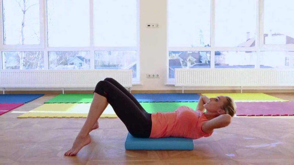 - Для укрепления мышц пресса сядьте на подушку с ровной спиной, согните ноги в коленях, опустите верхнюю часть тела на пол. Сделайте 10-15 подъемов, не помогая себе руками. Если вы хотите усложнить упражнение, поднимайте одновременно и корпус и слегка согнутые в коленях ноги.
