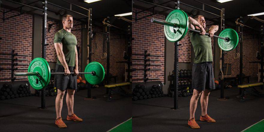 - Вдохните и протяните штангу вдоль тела вплоть до подбородка. Локти тяните вверх. Предплечья держите максимально вертикально полу. Не сгибайте кисти.