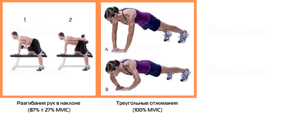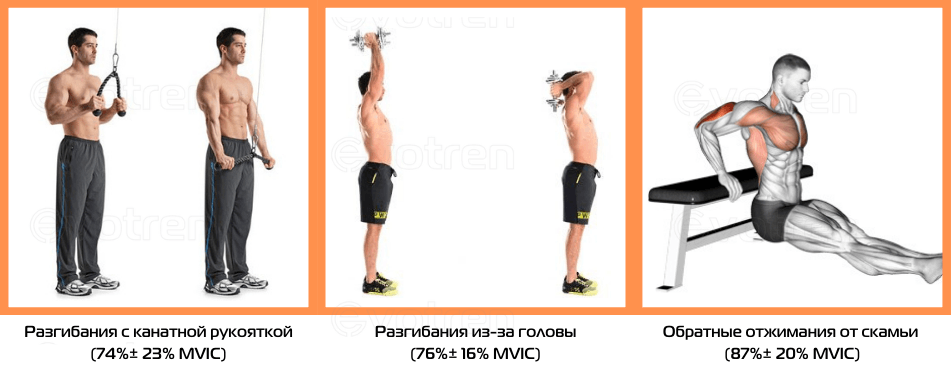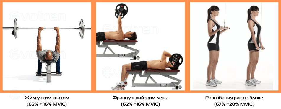 Показания электромиографии в упражнениях на трицепс.