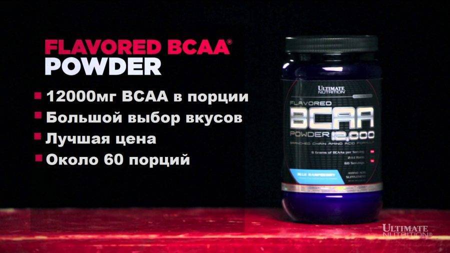 Аминокислоты с разветвленной цепью (Ultimate Nutrition BCAA 12000 Powder) включают в себя лейцин, изолейцин и валин. Эти аминокислоты необходимы для поддержания мышечной ткани во время физических нагрузок и интенсивных тренировок. По мнению атлетов, BCAA работают, как анаболические агенты, которые предотвращают потерю мышечной массы.