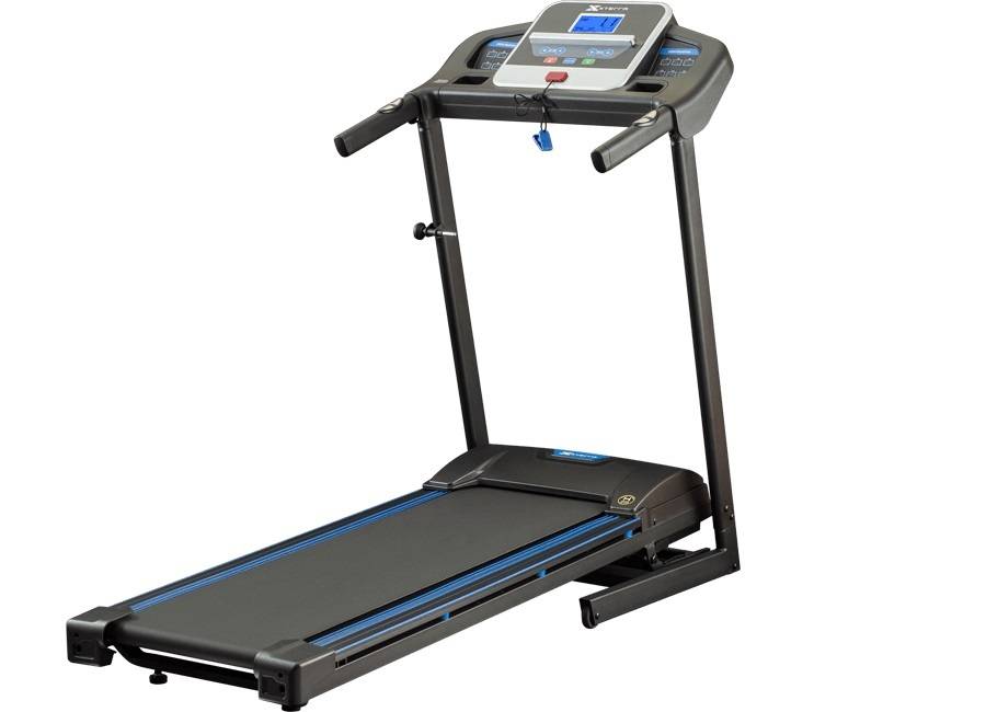 Дисплей отображает пройденное расстояние, скорость, пульс, расход калорий. Датчики измерения пульса традиционно расположены на рукояти прибора. Угол наклона полотна можно скорректировать вручную. Максимальный вес пользователя – 100 кг. Складная конструкция тренажера, помогает экономить пространство в квартире и оптимально организовать хранение беговой дорожки. Передвинуть её можно с помощью транспортировочных роликов.