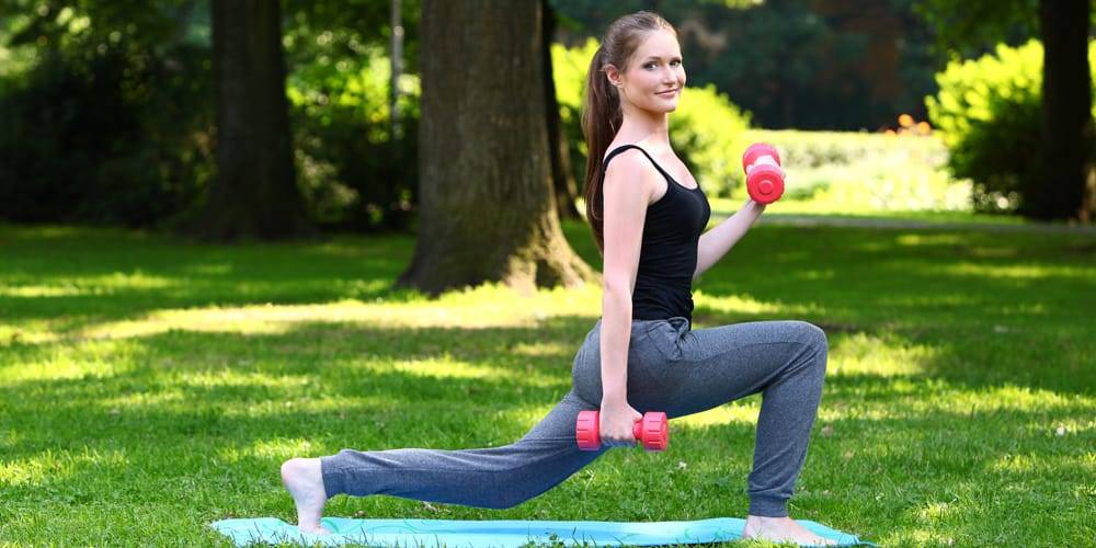 Вначале важно удерживание балансировки с последующим увеличением глубины выпадов. При выполнении выпадов с гантелями мышцам рук также обеспечивается тренировка