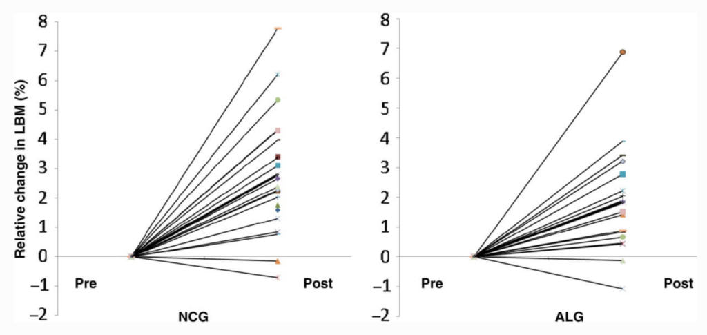 Вот к примеру, насколько разной была прибавка мышечной массы (в %) у атлетов за 12 недель тренировок.