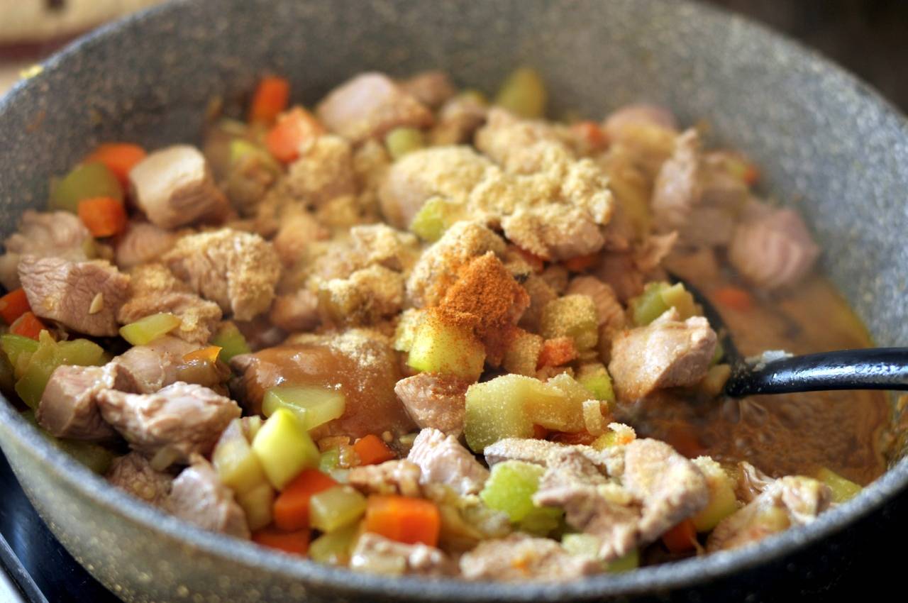 - Измельчить мясо индейки на небольшие ломтики. Поместить мясо на сковороду, добавить оливковое масло и готовить до образования золотистого цвета. Для готовки следует использовать большую сковороду.