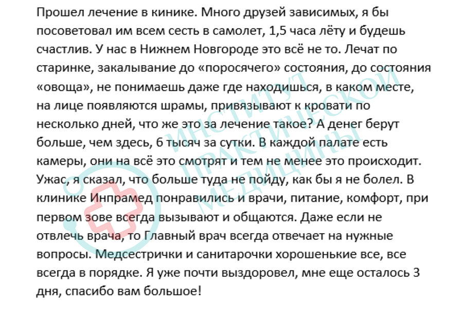 - Однозначно, что это круглосуточный контроль над состоянием человека. Специалисты нашей клиник Инпрамед имеют стаж работы не только более 20 (да что уж там, почти 30) лет, но и самое человеческое отношение, какое только может быть. В подтверждении можете прочесть пару реальных отзывов.