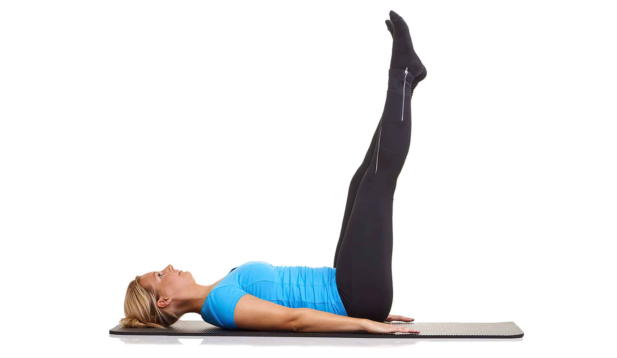 - Медленно поднимайте ноги вверх, не сгибая коленей.