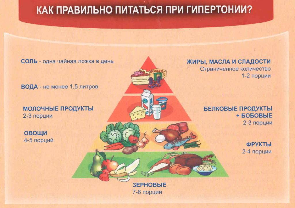 При первых симптомах повышенного давления (головокружении, тошноте, болях в сердце, «двоении» в глазах), важно, в первую очередь, снизить суточную порцию соли (до 3 грамм), увеличить суточный объём выпиваемой воды (до 2-х литров), исключить из пищевого рациона животные жиры, обогатить меню калием и магнием. Полезные продукты питания для гипертоника: злаки (цельнозерновой хлеб, крупы), кисломолочные продукты (творог, сыворотка, кефир, сыр, ряженка), фрукты (лимон, яблоки, виноград, банан, финики, курага, чернослив), ягоды (клюква, черника, ежевика, клубника, малина, арбуз, дыня), зелень (сельдерей, лук, чеснок, кинза, базилик, петрушка), овощи (картофель, свёкла, морковь, капуста), нерафинированные растительные масла (кедровое, рыжиковое, льняное), бобовые (чечевица, горох, фасоль), орехи (фундук, кешью, грецкие, миндаль)