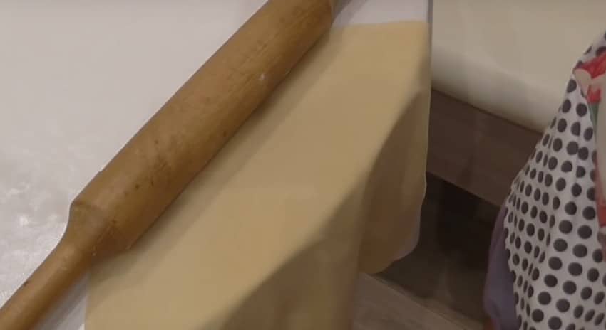 2. Раскатайте его в тонкую, практически прозрачную, лепешку. Натрите ее мукой с двух сторон и слегка подсушите, периодически переворачивая или свесив со стола.