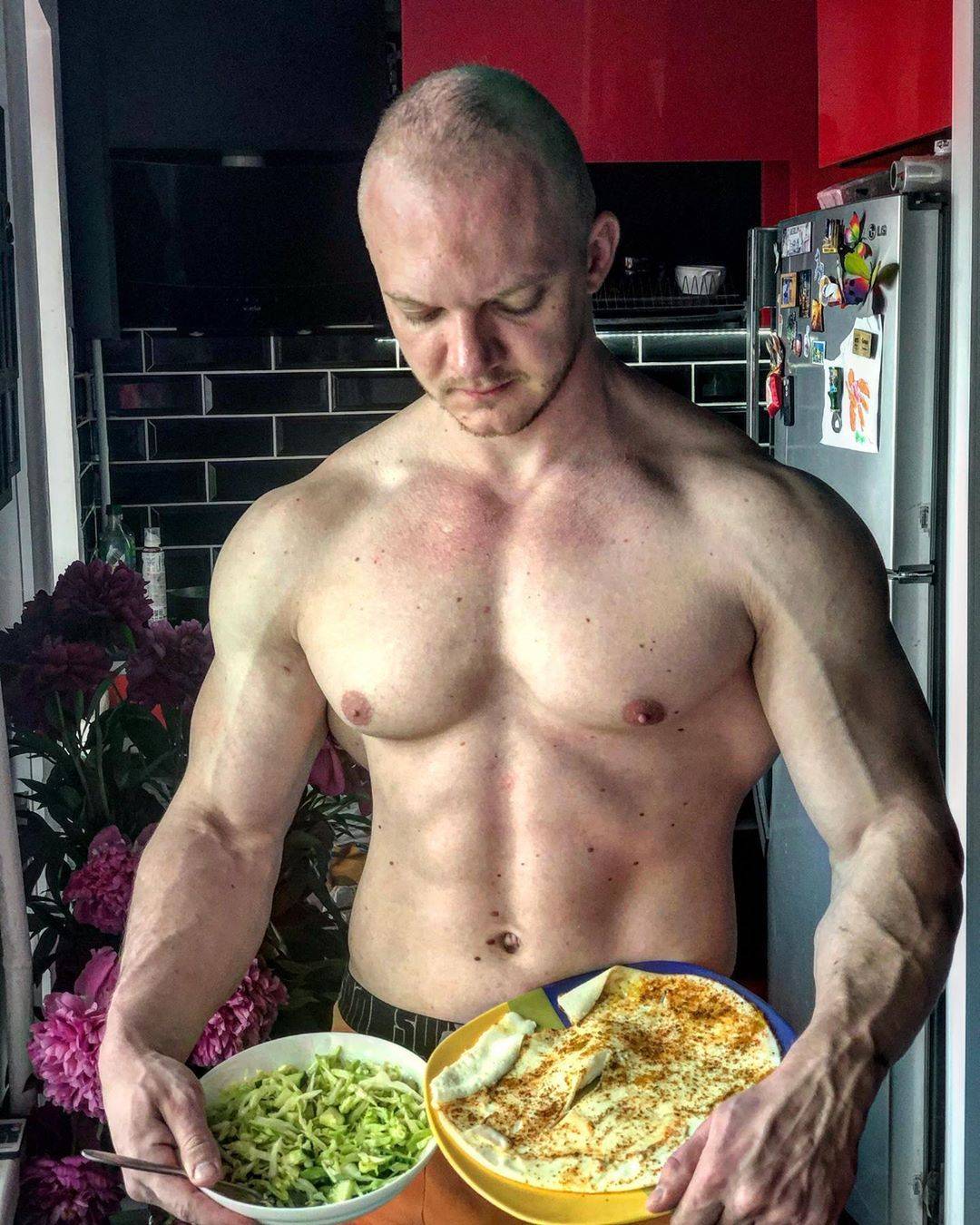 Не только про добавки рассказывает бодибилдер, но и про особенности рациона, полезные и дающие правильный «выхлоп» для сушки и рекомпозиции тела. Не только «Дженетиклабом» единым и «Соматексом» жив настоящий качок! Вот пример меню на завтрак, мужчина с радостью делится с коллегами-спортсменами секретами правильного рациона: яичница из десяти белков, салат из капусты и огурцов, (заправляется льняным маслом). Обед: картошка с рыбой или куриным мясом, грибы и спаржа, на десерт – творожные сырники, киви.