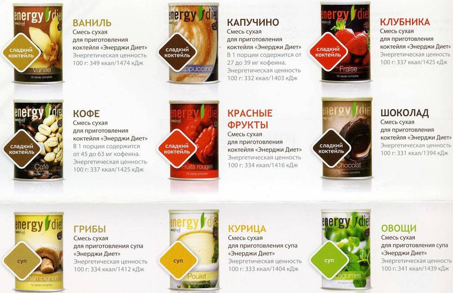 Широкая гамма «готовых блюд» позволяет разнообразить диетический рацион питания. В стандартный набор Энерджи диет входят 17 концентратов. При желании, коктейли можно соединить с разрешенными овощами, красными фруктами (допустимые ингредиенты рассмотрим подробно в разделе «Программа похудения ED»), грибами, курицей, получая новые вкусы.