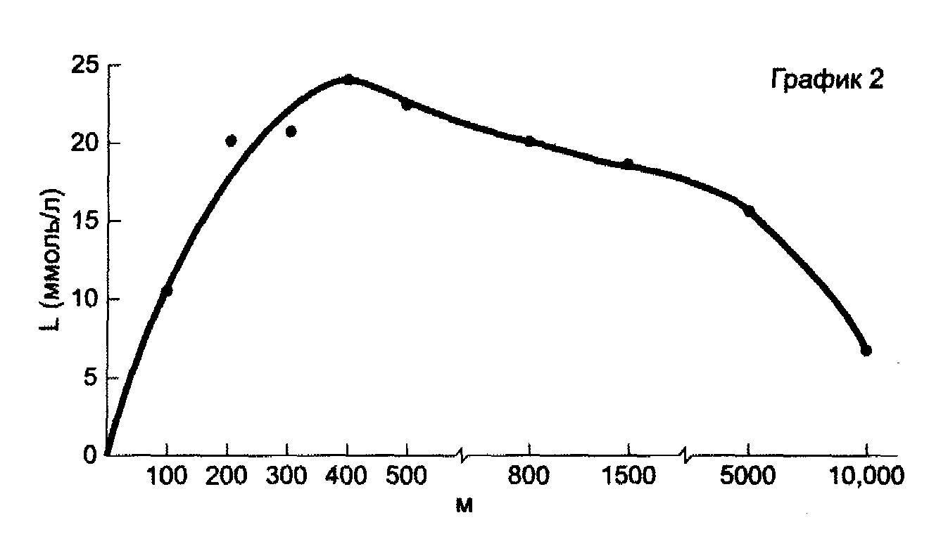 Лактат может быть в 20 раз выше нормы. Максимальная концентрация молочной кислоты достигается в беге на 400 м. С увеличением дистанции концентрация лактата снижается (График 2).