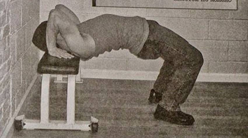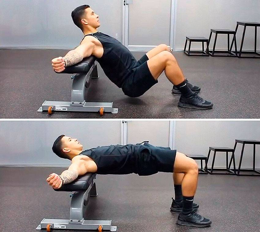 Это движение еще носит название «мостик со скамьи» или «мост с опорой. Смысл в том, чтобы сократить амплитуду растягивания позвоночника, разместив руки и верхнюю часть тела на опоре