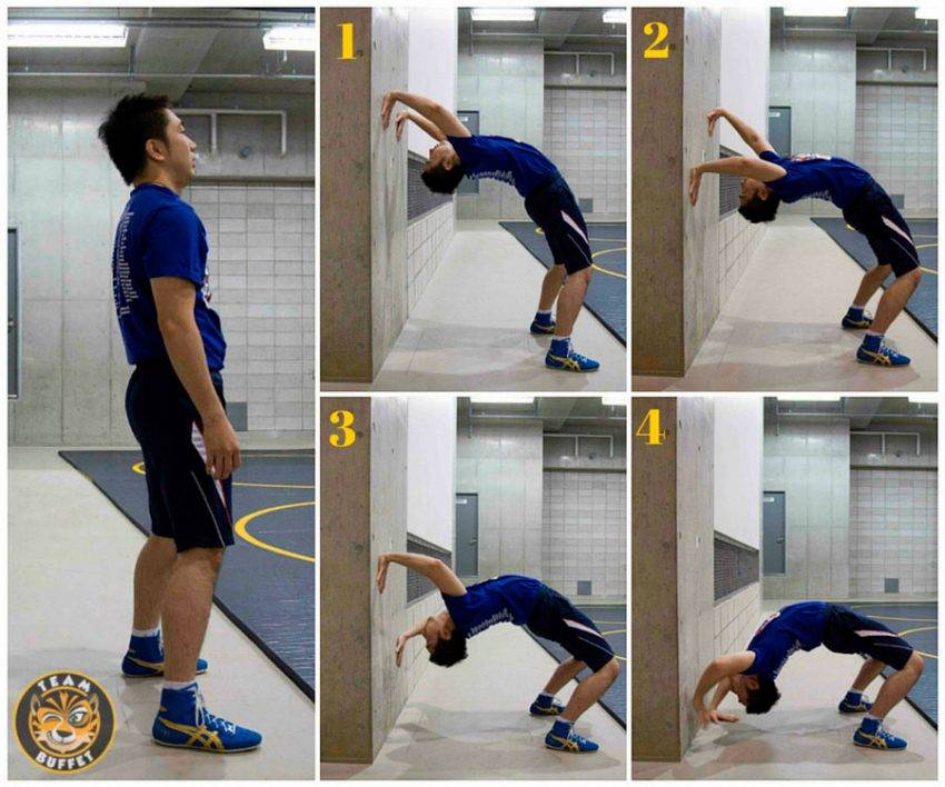 Это подводящее упражнение для моста из положения стоя. Нужно встать рядом со стеной, принять прогиб в грудном отделе и далее: