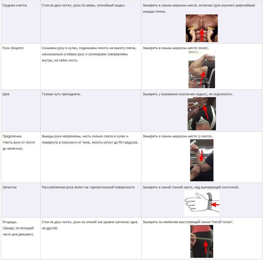 Если вы решили вопрос лишнего веса или излишней худобы, вашими лучшими друзьями должны стать зеркало и швейный сантиметр. Что касается сантиметра, следует вести регулярный контроль за тем, сколько сантиметров в объёме составляют ключевые звенья вашей фигуры. Измерения нужно производить рано утром, когда вы только проснулись, ваше тело пришло в норму, отдохнуло, а мышцы расслаблены. Единственным исключением могут быть люди, по тем или иным причинам страдающие отёчностью по утрам. Не нужно затягивать сантиметр до боли, но и висеть он не должен. Также не имеет никакого смысла (помимо получения удовольствия) производить замеры после интенсивной тренировки, если вы ещё не готовите себя к выходу на большие сцены бодибилдинга, где перед выступлением вы сможете забить свои мышцы. Мы будем исходить из того, что все мы обычные люди и 75% нашего времени окружающие видят нас не на пампе.