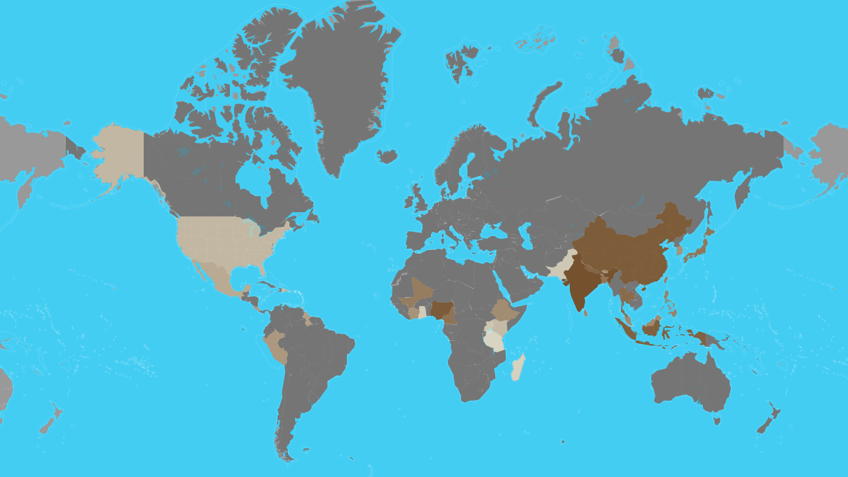 КАРТА СТРАН, ГДЕ СЕГОДНЯ ВЫРАЩИВАЮТ ИМБИРЬ. ЧЕМ ПЛОТНЕЕ КОРИЧНЕВЫЙ ЦВЕТ – ТЕМ БОЛЬШЕ ИМБИРЯ ВЫРАЩИВАЕТ СТРАНА.