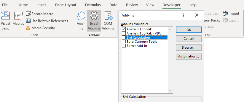 В диалоговом Add-Ins диалоговом окне найдите Add-In, на который мы хотим установить (в данном случае это вычисление ИМТ), убедитесь, что почтовый ящик вычислений BMI не проверяется. Нажмите кнопку ОК.