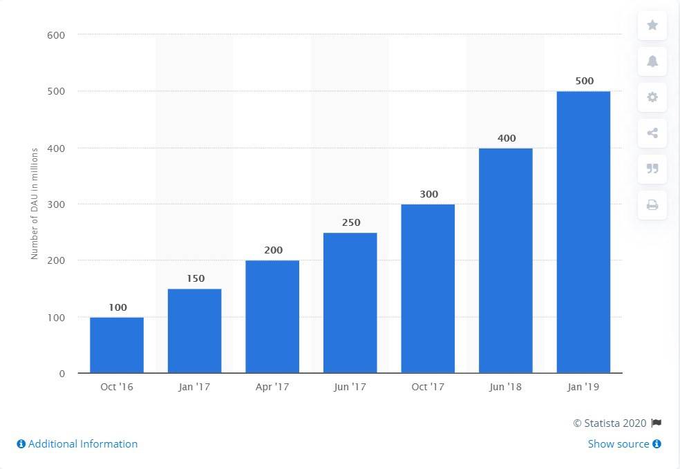 Инстаграм представил функцию Stories летом 2016 года, к 2018 ежедневная аудитория историй составила 400 млн., к 2019 году число активных пользователей достигло 500 млн. по данным, объявленным Цукербергом. Все 500 млн.человек в день просматривают истории.