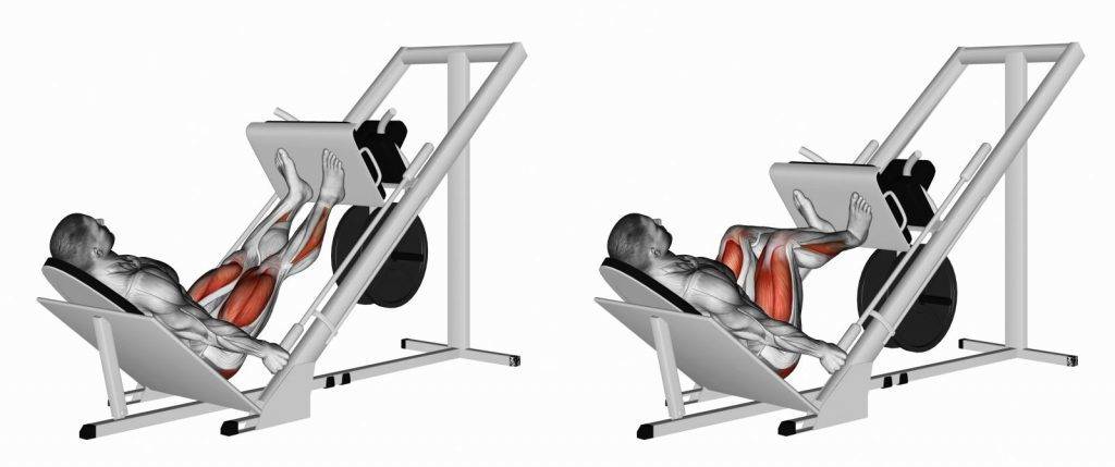 Техника выполнения: тело должно быть плотно прижато к спинке тренажера и не отрывать во время выполнения всего сета; сгиб коленей сохраняется всегда; пятки непрерывно «приклеены» к платформе; положение и направление ступней можно менять в зависимости от того, какую область ноги нужно задействовать.