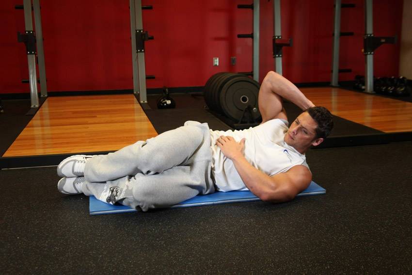 Выполните скручивание, отрывая лопатки от пола, при этом, не отрывая от пола нижнюю часть спины.
