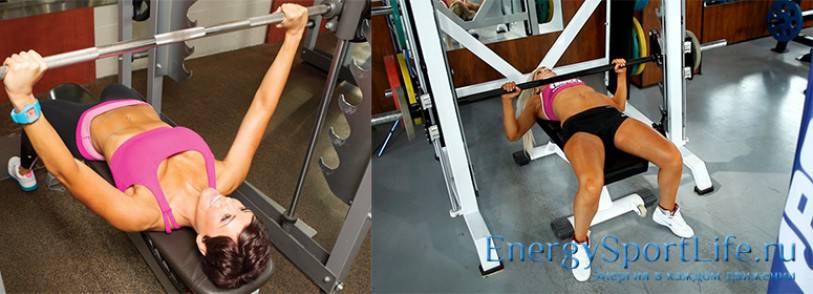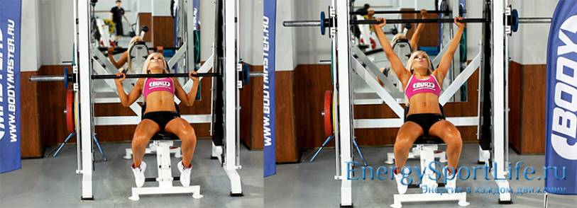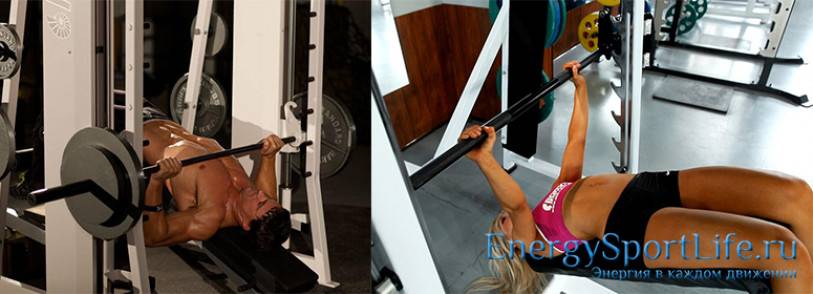 На скамью Смита необходимо лечь, гриф снять, расположив кисти чуть шире плеч. Ведущее движение вниз выполняется на вдохе, подконтрольно, почти до груди. Мощный рывок вверх выполняется на выдохе, при этом в локтях должен сохраниться угол.