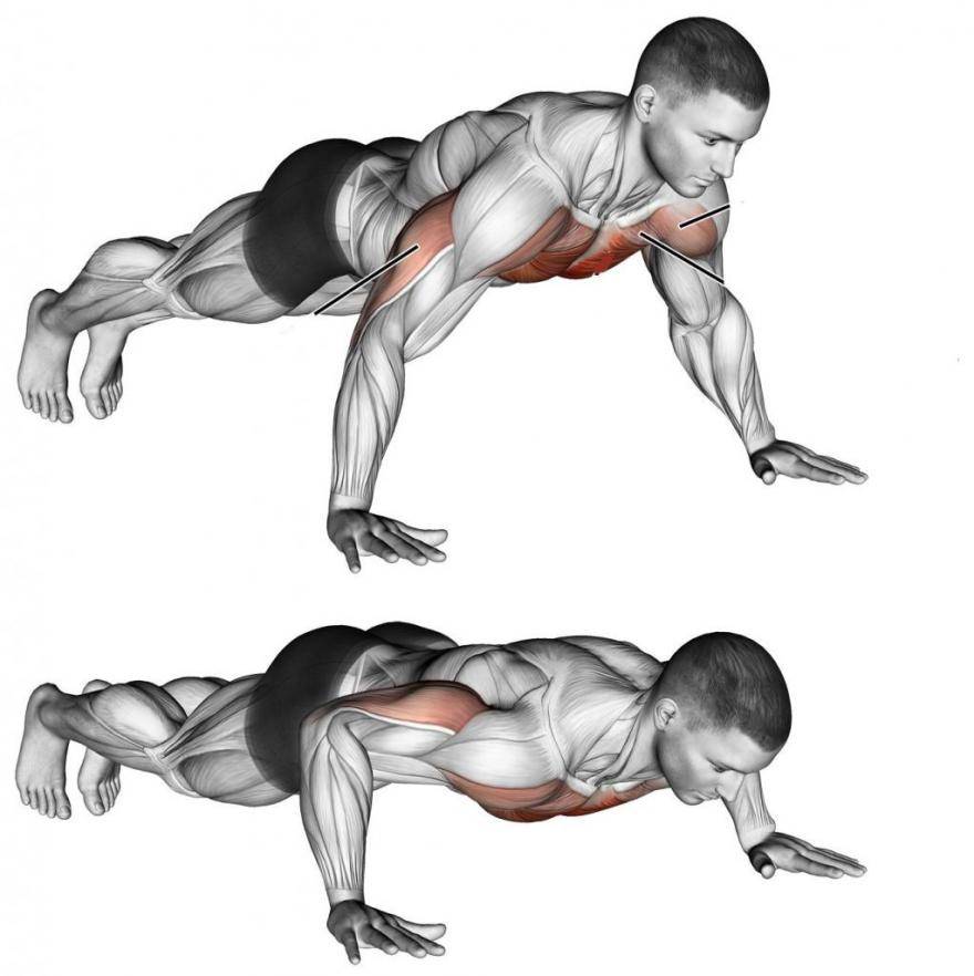 - Стартовое положение — упор лежа на прямых руках.