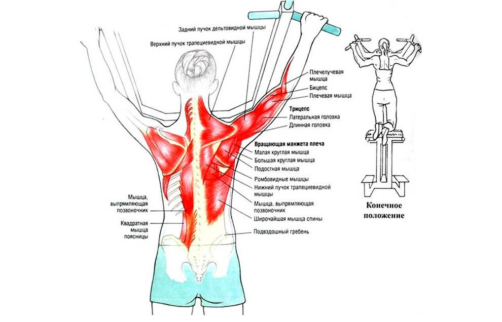 - Медленно верните руки вниз в исходное положение. Мышцы рук должны быть напряжены, чтобы оставаться прямыми. Выполняйте всю работу за счет мышц спины.