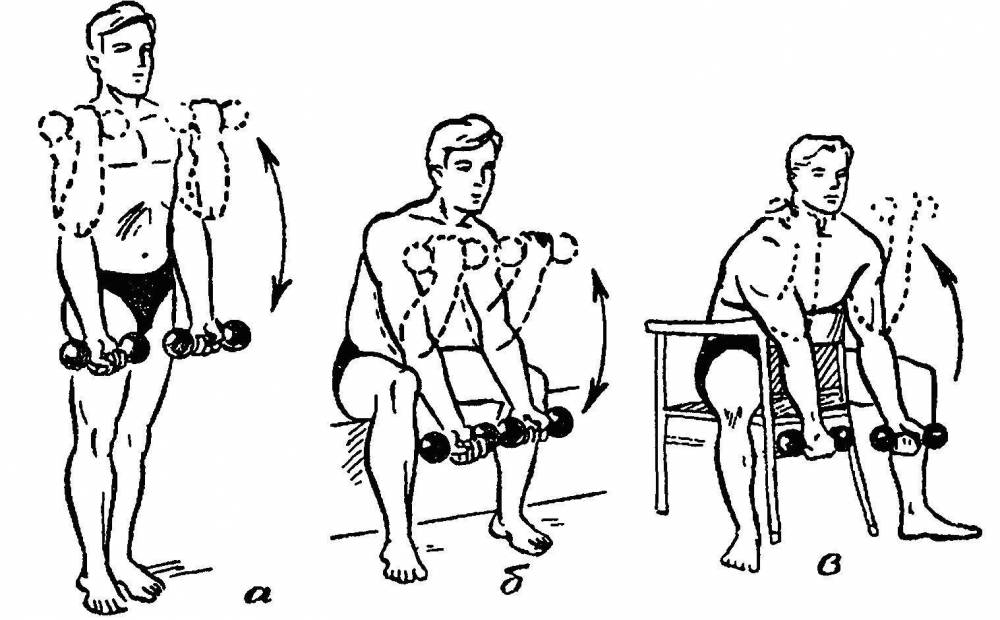 - Подъем одной рукой. Сидя, немного наклонив корпус вперед, положить локоть на бедро. Осуществлять концентрированные сгибания, когда работает только бицепс. Можно выполнять одновременно двумя руками, если найти точку опоры (например, спинку стула).