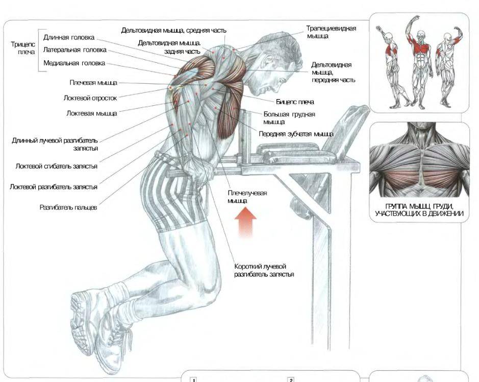 Отжимаясь от турника, Вы будете тренировать те же мышцы, что во время отжимания от брусьев.