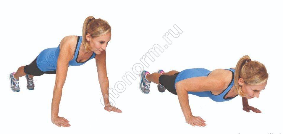- Примите упор лежа на вытянутых руках, расположенных на ширине плеч. Ноги слегка разведите. Тело должно быть прямым, без прогибов в спине и торчащих ягодиц;