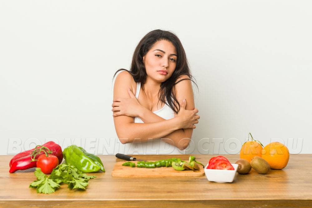 Дефицит калорий заставляет организм уничтожать жировые запасы в ускоренном темпе. В таком режиме он попросту не успевает адаптироваться к новым условиям, поэтому страдает механизм теплорегуляции – тело начинает зябнуть. Когда жировая прослойка истончается, какую-то часть энергии организм «вытаскивает» из мышечной массы. В свою очередь она теряет часть объема, а это чревато замедлением обменных функций. Как следствие – снова зябкость.