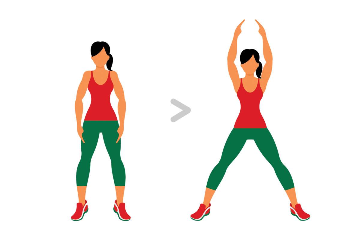 Начните домашнюю кардио тренировку с выполнения прыжков с хлопком руками. Исходное положение — стоя ровно, ноги на ширине плеч, руки вдоль тела, живот втянут. На вдохе, в прыжке, расставьте ноги в стороны, одновременно совершая хлопок руками над головой. На выдохе вернитесь в исходное положение.