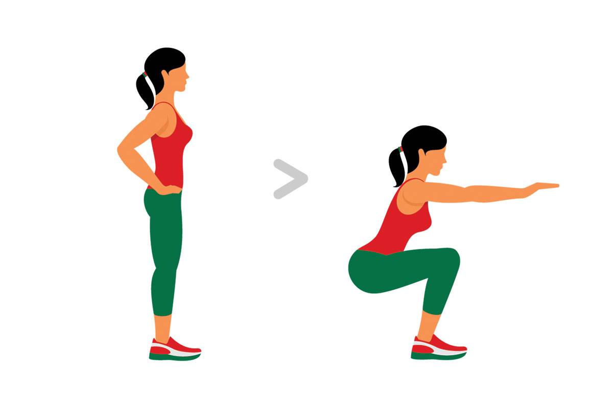 Без отдыха переходите к приседаниям с вытянутыми вперед руками. Исходное положение — стоя ровно, ноги на ширине плеч, руки на поясе. На выдохе опуститесь вниз, словно садясь на стул (для соблюдения правильной техники вы можете использовать стул или фитбол) — руки вытянуты вперед. Вернитесь вверх, повторите.