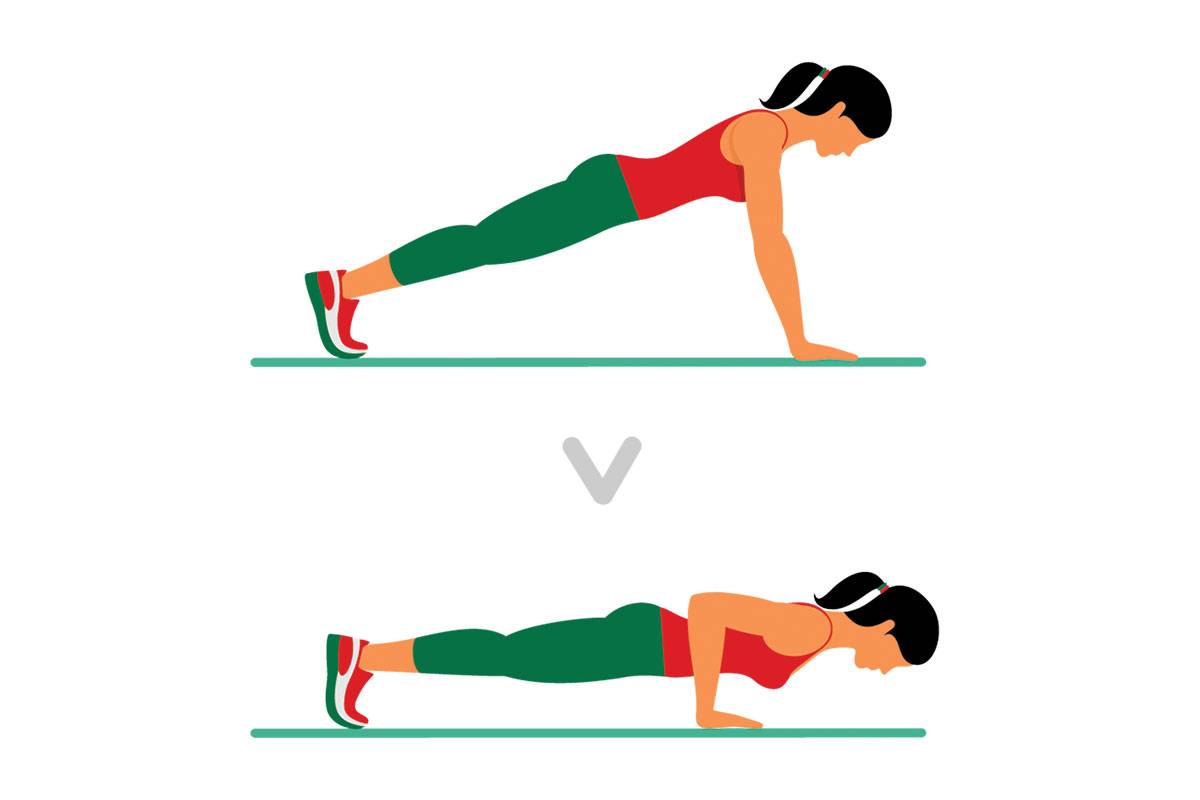 Техника выполнения: начните с положения для отжимания. Согните колени и отодвиньте свое тело назад, пока ваши руки не образуют прямую линию с позвоночником. Держите мышцы кора в тонусе, когда будете возвращаться в положение планки. Это одно повторение.