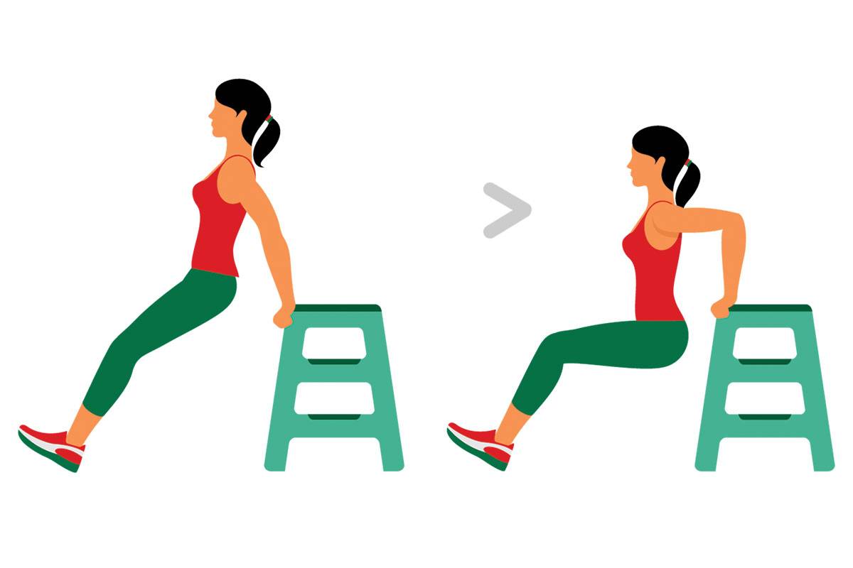Техника выполнения: начните с положения для отжимания. Согните колени и отодвиньте свое тело назад, пока ваши руки не образуют прямую линию с позвоночником. Держите мышцы кора в тонусе, когда будете возвращаться в положение планки. Это одно повторение.