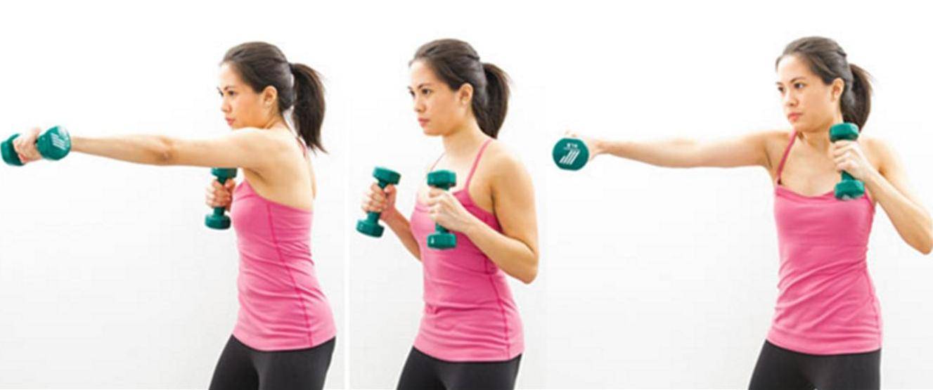 Упражнение, полезное и для мужчин, и для женщин, разница только в весе гантелей. Нет гантелей – возьмите бутылки с водой или что-то подобное. Можно и просто сжать руки в кулаки. Быстро боксируйте, бейте снизу и прямо, левой, правой, и двумя руками сразу. Если будете уходить в присед, прогибаться, переставлять ноги, делать махи – эффект будет еще заметнее.