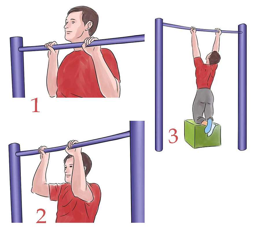 Поставьте стул за перекладиной так, чтобы могли беспрепятственно опускаться и подниматься на турнике. Встаньте на него, возьмитесь прямым хватом на ширине плеч (ладони направлены от вас) за турник и согнув локти, подбородок держа чуть выше перекладины, повисните в таком положении на пару секунд. Затем как можно медленней, сопротивляясь весу, выпрямляйте руки в исходное положение, опустив тело вниз.