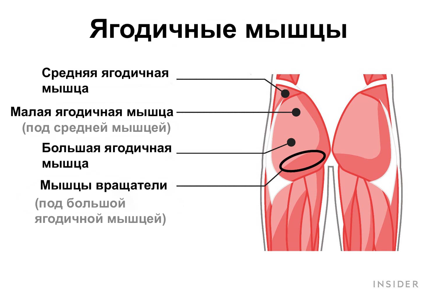 - Большая ягодичная мышца. Данная мышца задействуется в разгибании бедра, например, когда вы ходите, и для вращения бедра, как при скручивании ноги.