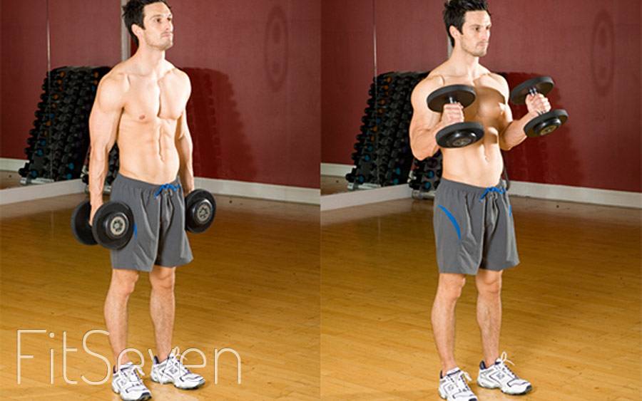 Ключевым моментом техники является то, что при выполнении упражнения ладонь с гантелей совершает поворот на 90 градусов. Это увеличивает вовлечение плечевой мышцы, выталкивая таким образом бицепс вверх и увеличивая его визуальный объем.