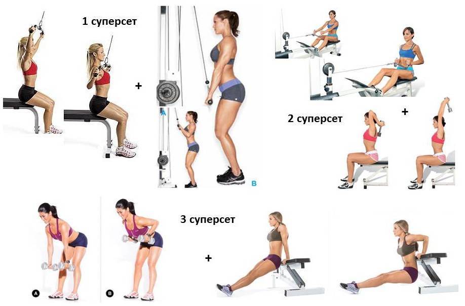 Выполняется супер сетом для максимального эффекта. Отдых между сетами – не более 25-30 секунд.