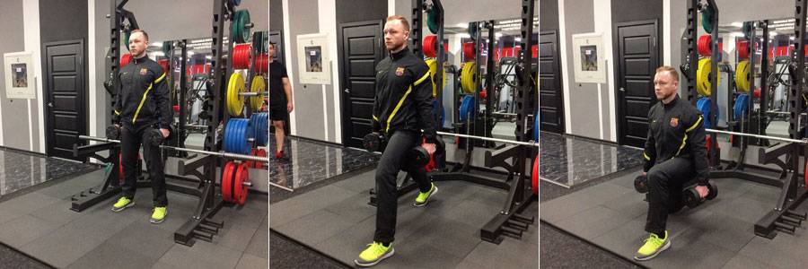 - Делается широкий шаг и присест к одной ноге, вторая сзади тоже сгибается. Вес располагается у носочка, колено второй конечности не касается пола. Корпус прямой, старайтесь удерживать равновесие. Становимся в исходное положение, используя толчок передней ноги.