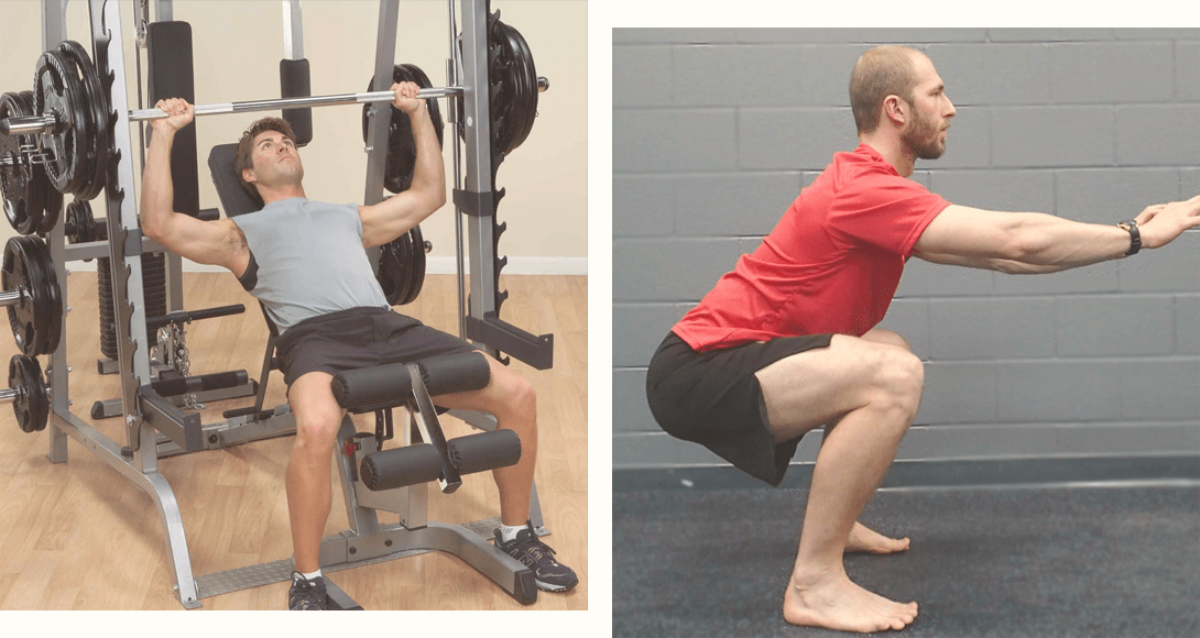 Когда ты выполняешь приседы на тренажёре Смита, фиксированная штанга заставляет твоё тело совершать неестественные линейные движения, из-за чего спина не может выгнуться как обычно, и повышается нагрузка на поясницу. Кроме того, не остаётся манёвра для отклонения суставов в стороны, что повышает риск травмирования коленей.