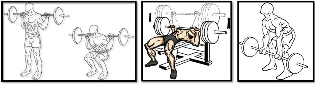 жим лежастановая тягаподтягиванияхприседания со штангойармейский жимтяни-толкай-ноги тренировочный сплит