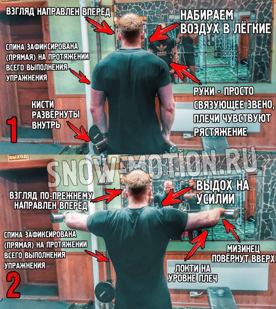 - Махи гантелями можно выполнять с разворотом кистей или без него. Большинству атлетов лучше подойдет первый вариант.