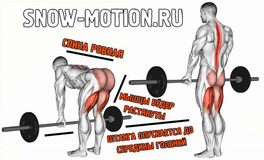При выполнении стоит как можно сильнее растягивать мышцы задней поверхности бедра. Это была классическая версия тяги, выполняемая со штангой. От становой отличается так же и тем, что штанга опускается не пола, а лишь до середины голеней. Для девушек лучше выбрать узкую постановку ног, чтобы включались в работу ягодичные мышцы, а для мужчин — широкую, смещая центр тяжести на бицепс бедра.