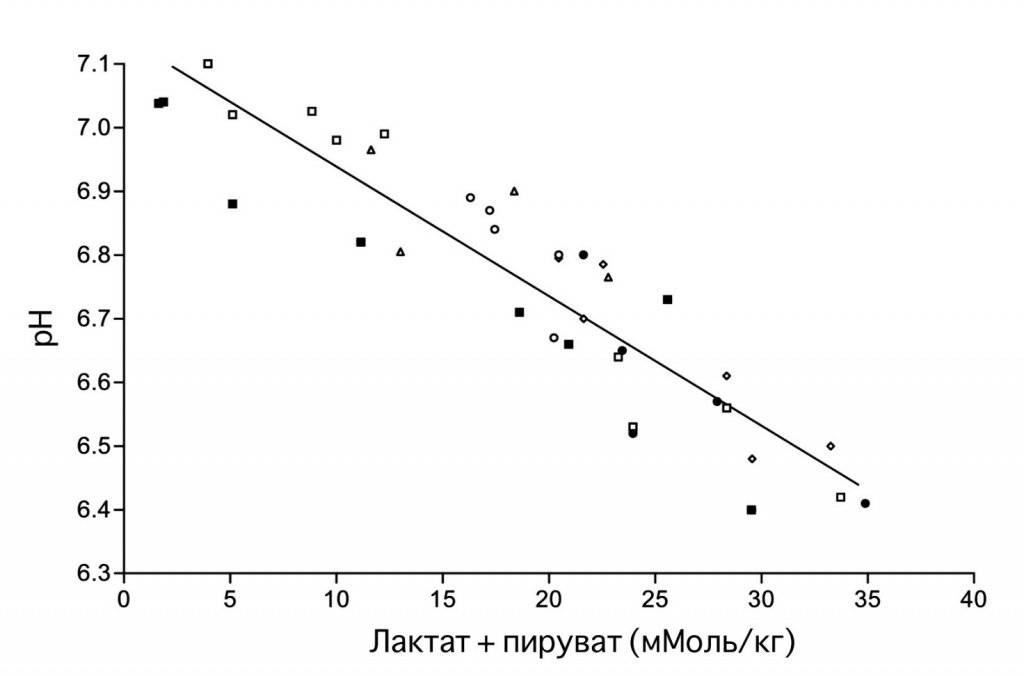 Рис. 1. Между рН среды в мышечной клетке, с одной стороны, и количеством пирувата и лактата, с другой, обнаруживается яркая линейная корреляция. Однако она еще не говорит о причинно-следственной связи.