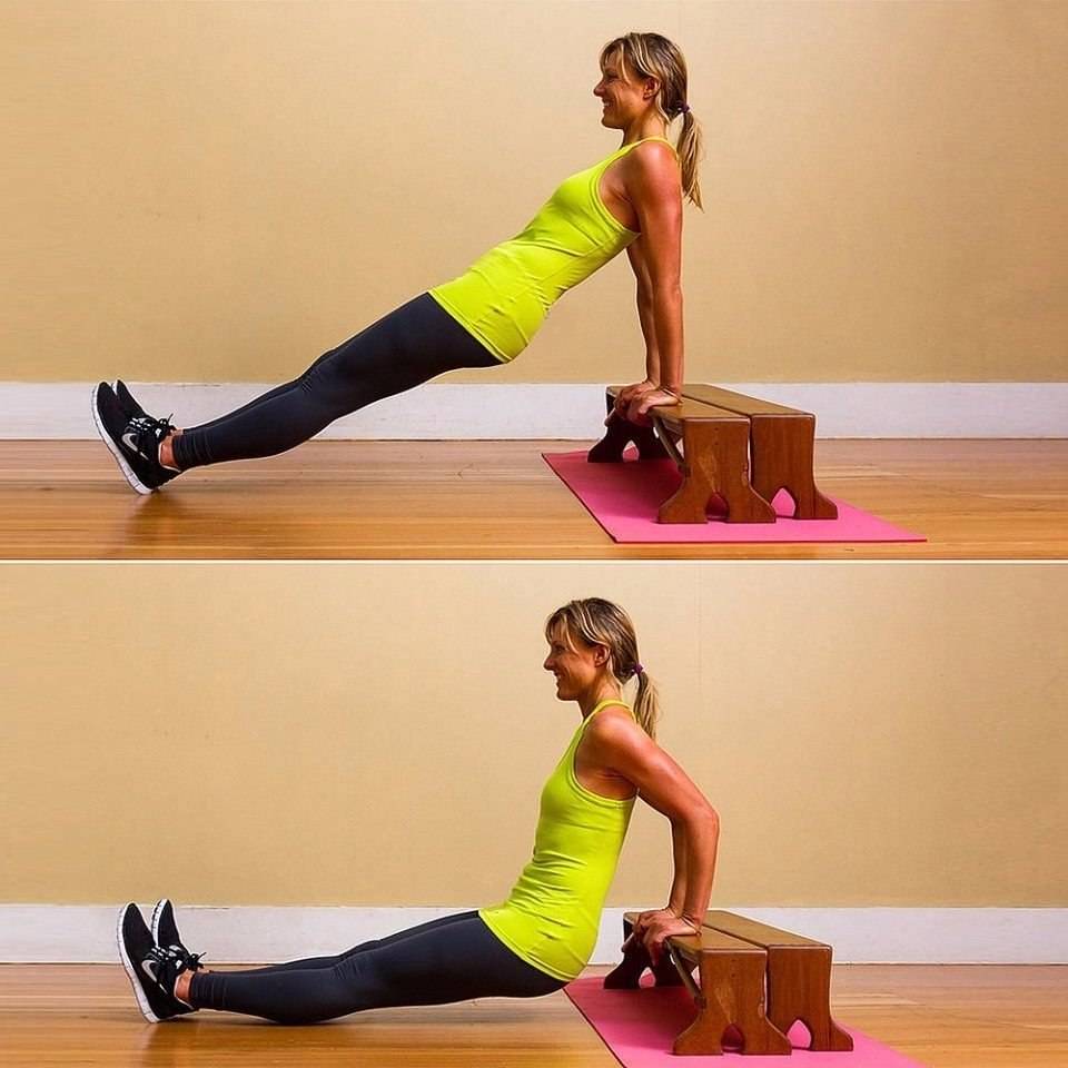 Техника выполнения: упор сзади на ладони на краю скамейки, а также на пятки. Ягодицы направлены в пол. На выдохе — согнуть руки в локтях до образования прямого угла. На выдохе – вернуться в ИП, выталкивая себя наверх с помощью трицепсов.