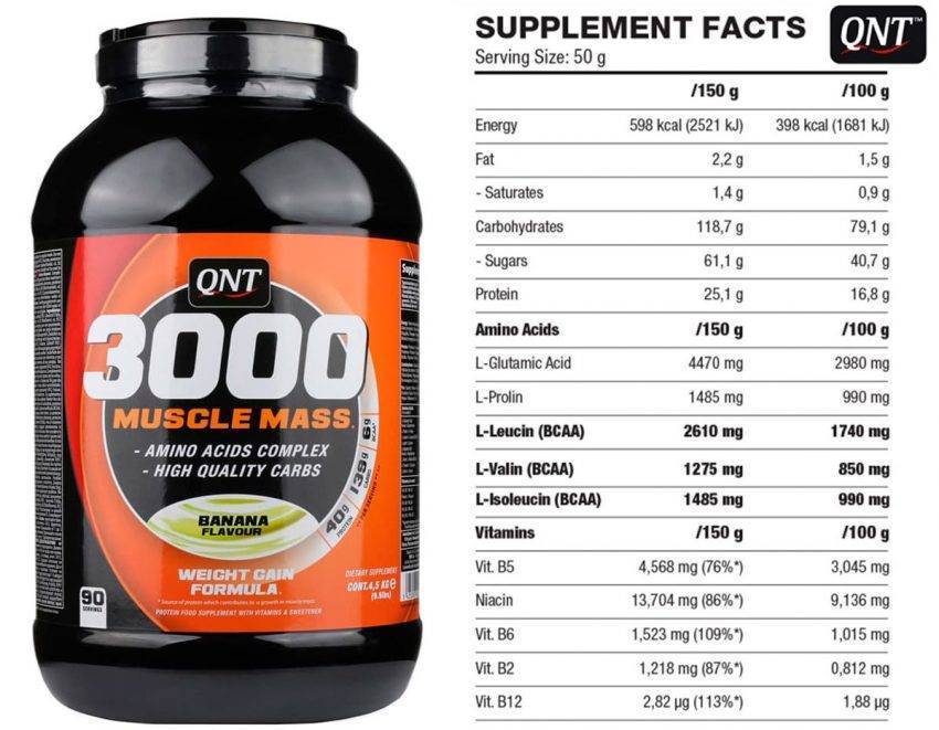 Комплекс от бельгийского производителя QNT полностью соответствует высочайшим стандартам европейского качества. Он прекрасно усваивается организмом, быстро растворяется в различных жидкостях при приготовлении очередной порции. Углеводно-протеиновый гейнер содержит в себе белок превосходного качества, разнообразные минералы, витамины, микро- и макроэлементы. Белковая основа представлена в основном казеинатом кальция, а также углеводами, декстрозой, фруктозой, мальтодекстрином.