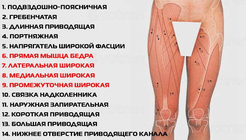Предлагаю рассмотреть несколько самых эффективных спец-упражнений для проработки четырехглавой бедренной мышцы и технику исполнения.