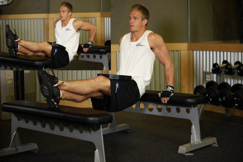 Лавки нужно поставить параллельно друг другу. Расстояние между ними – около 90 см. Сесть на одну из них, взявшись пальцами за ее край, ладони упираются в скамью и расположены примерно на ширине плеч, можно чуть шире, локти назад. Ноги положить на другую скамью. Руки полностью выпрямить в локтях, таз оторвать от лавки и сдвинуть его вперед, чтобы он выходил за пределы скамьи.
